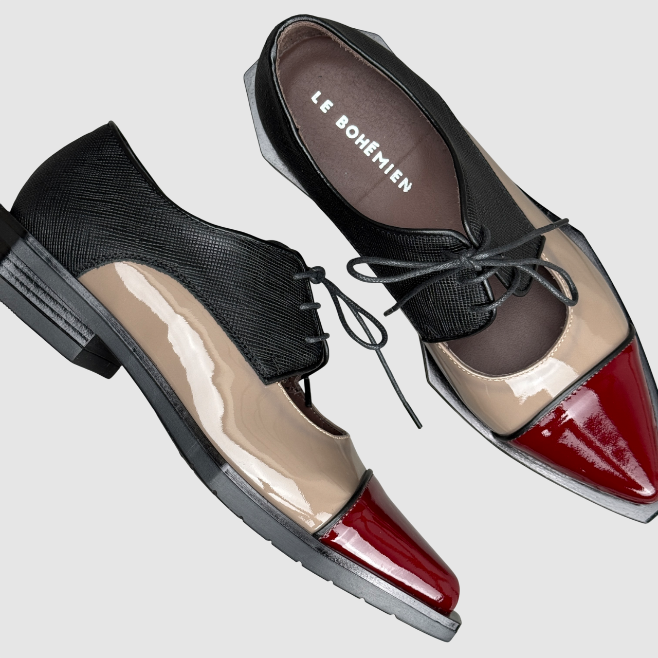 • Colori: pelle stampato nero + vernice taupe e bordeaux