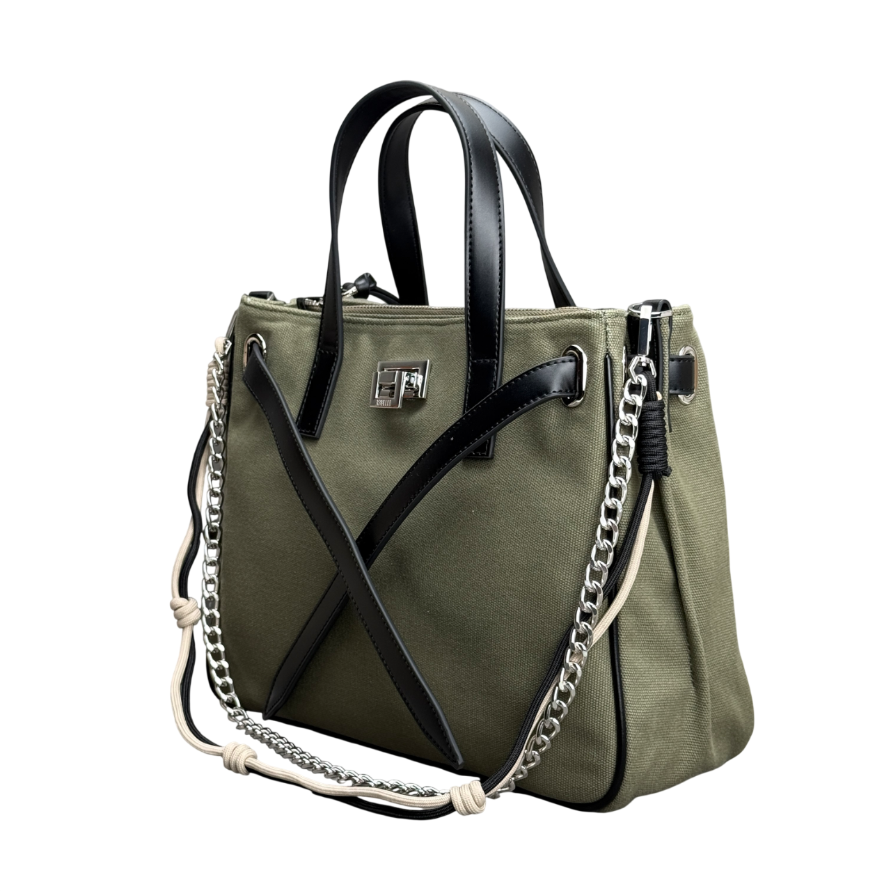 • Borsa a due manici con tracolla lunga e accessori in catena e tessuto rimovibili